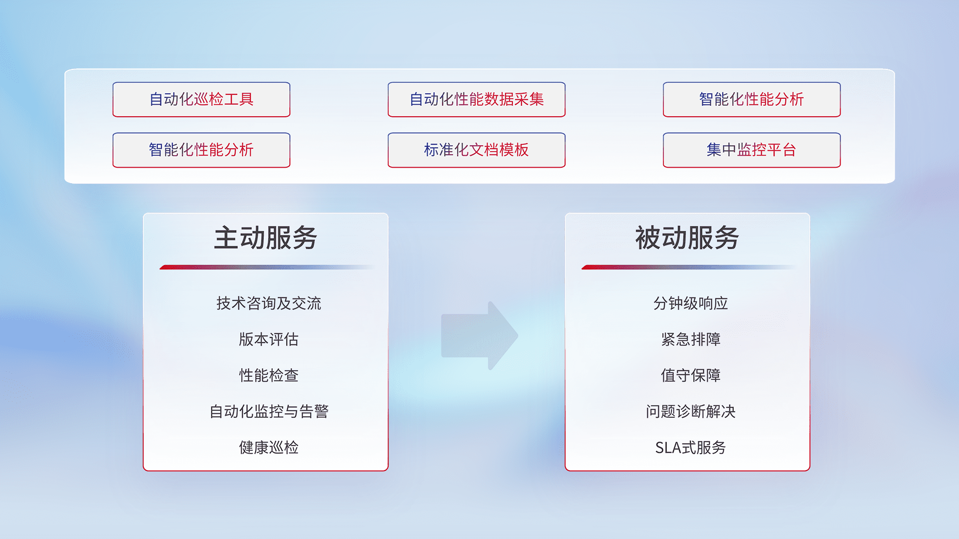 智能化工具和标准化文档,,,保障服务质量,,提供主动服务(包含技术咨询、、版本评估、、性能检查、、、自动化监控与告警、、健康巡检)和被动服务包含(分钟级响应、、、紧急排障、、、值守保障、、、、问题诊断解决、、、、SLA服务)。。