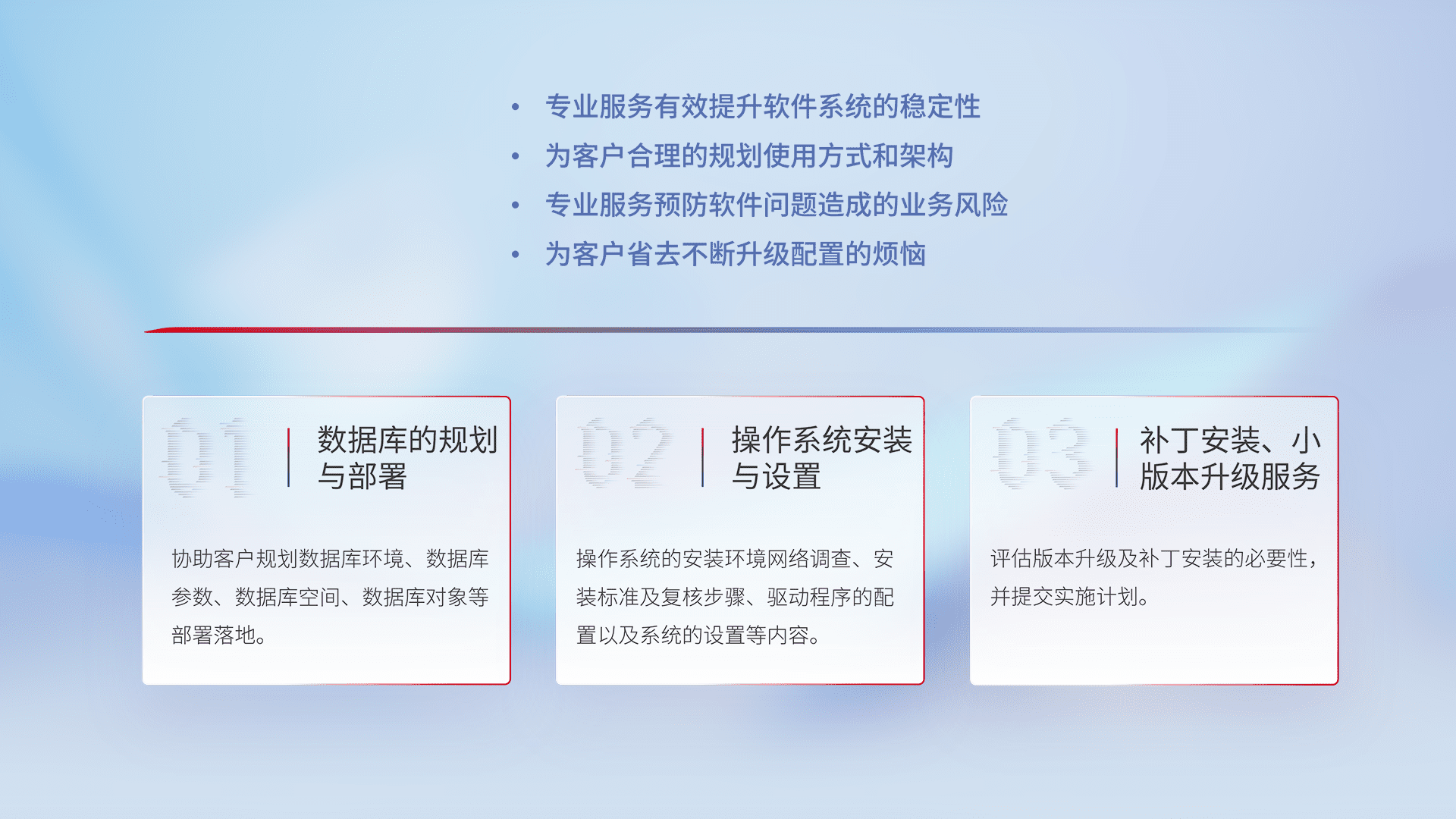 为客户提供软件规模升级、、、、快速部署、、、按需配置的专业服务,,,,从数据库的规划与部署到操作系统的安装与设置,,,,再到补丁安装和小版本升级提供支持。。。。