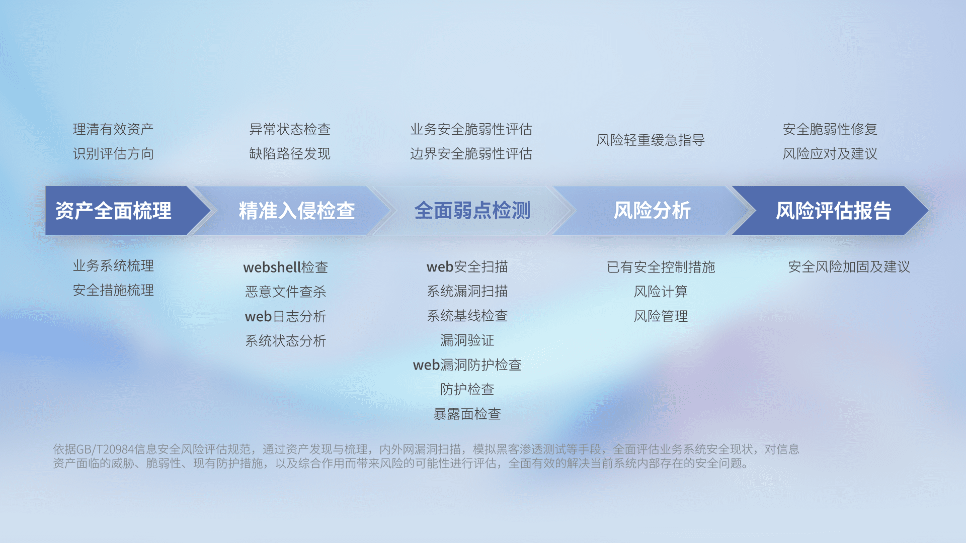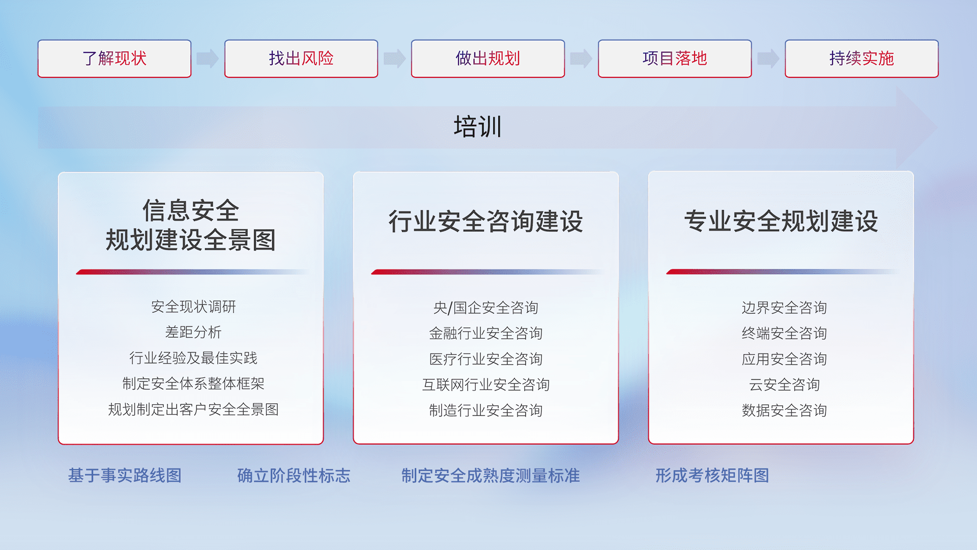 针对客户行业特性,,,,以专业的安全服务+多厂商联合解决方案提供专属的一站式安全管理服务,,,,帮助客户全面感知网络空间威胁,,,基于识别、、、检测、、分析、、、、防护、、、、监测、、、、响应的服务理论模型,,从方案咨询、、、集成交付、、、评估验证、、、、优化加固、、、、运维运营,,,,致力于为客户提供完整的闭环管理式安全服务。。以实战经验为客户打造高抵御风险的安全体系,,帮助客户发现威胁、、、、对抗威胁、、、、处置威胁,,,,不断积累安全对抗能力,,,持续保障数字化安全。。。